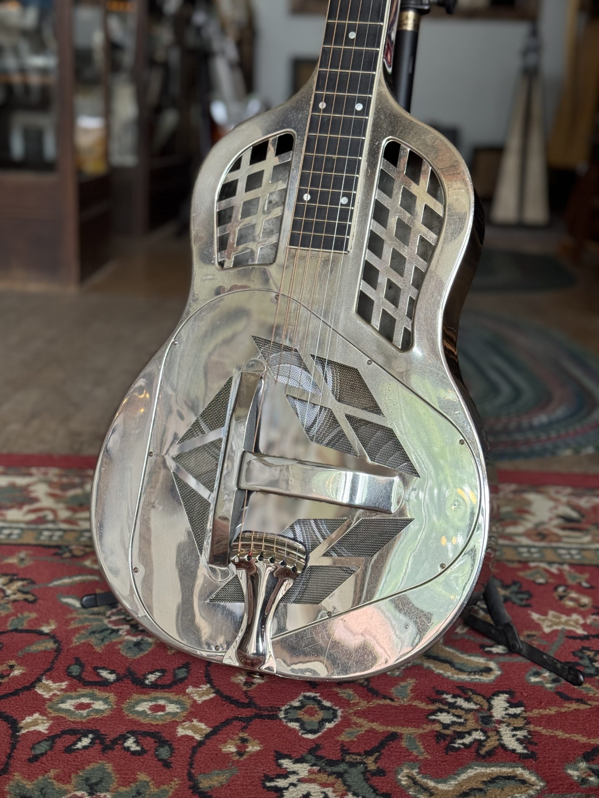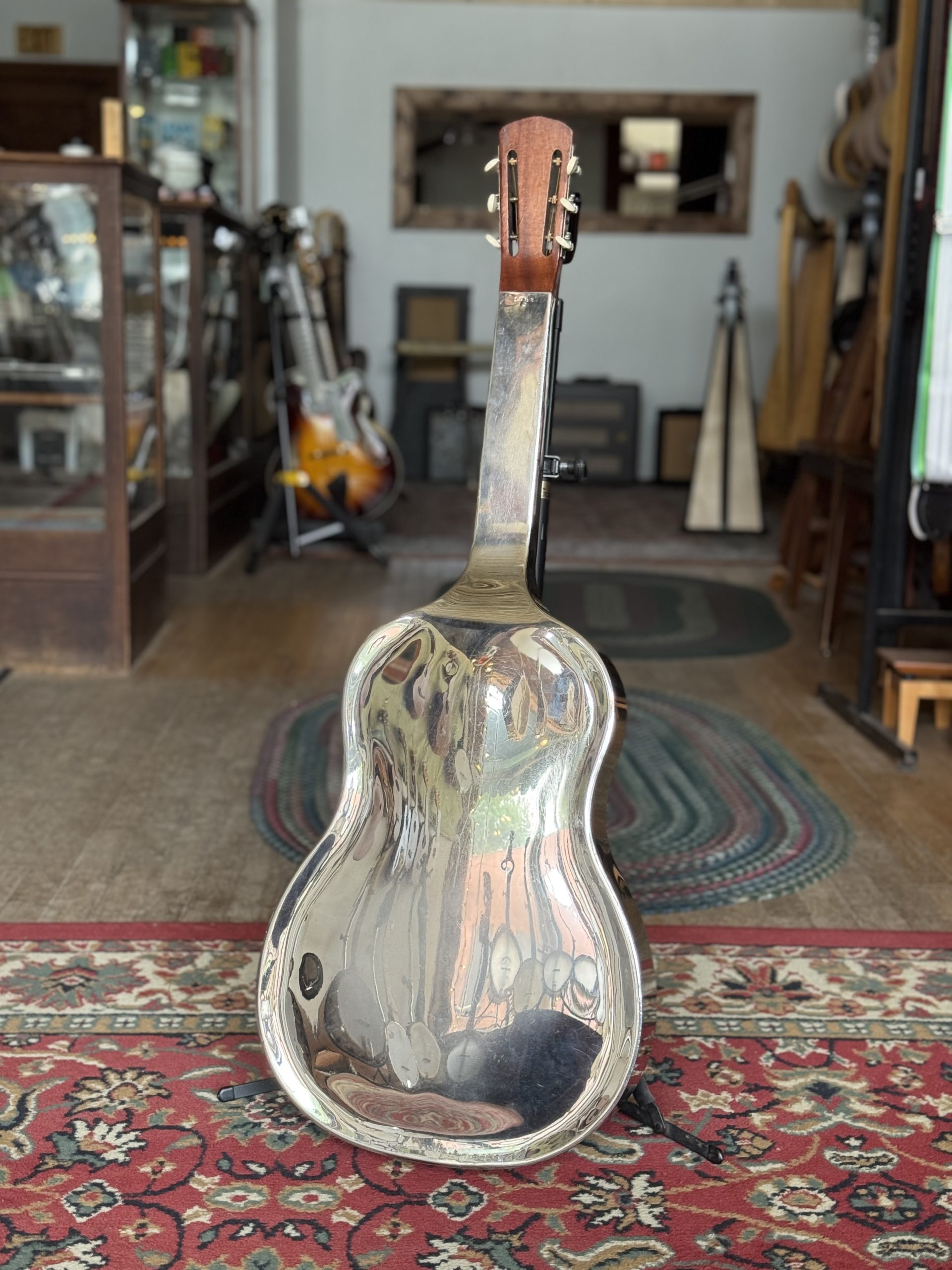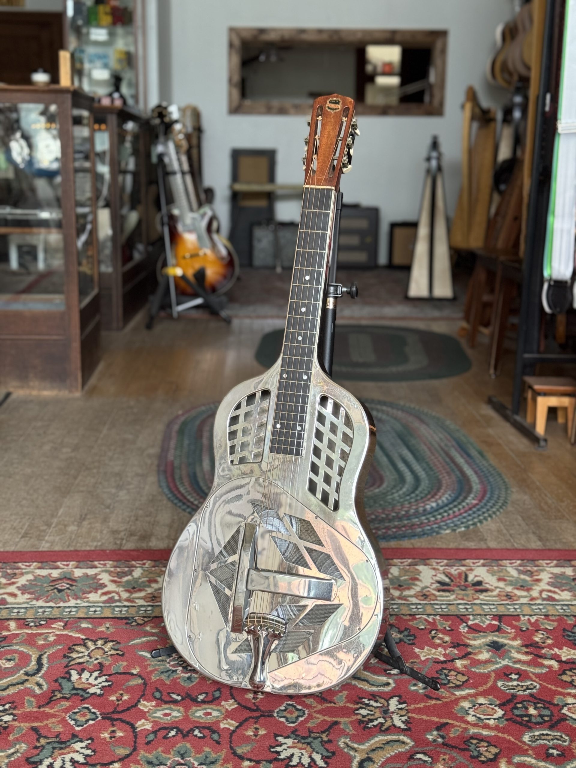 An advertisement of the era stated, “A Steel Guitar with twice the volume and three times the carrying power of the best wood guitar ever made… Records better, broadcasts better, sounds better and looks better than any guitar ever made. This new invention takes the guitar out of the parlor instrument class and makes a concert instrument of it suitable, for the largest theater or auditorium.” Strong words, but understandable considering the futuristic nature of such an instrument developed at the tail end of the Roaring Twenties and words that could be argued still hold up nearly a century later!