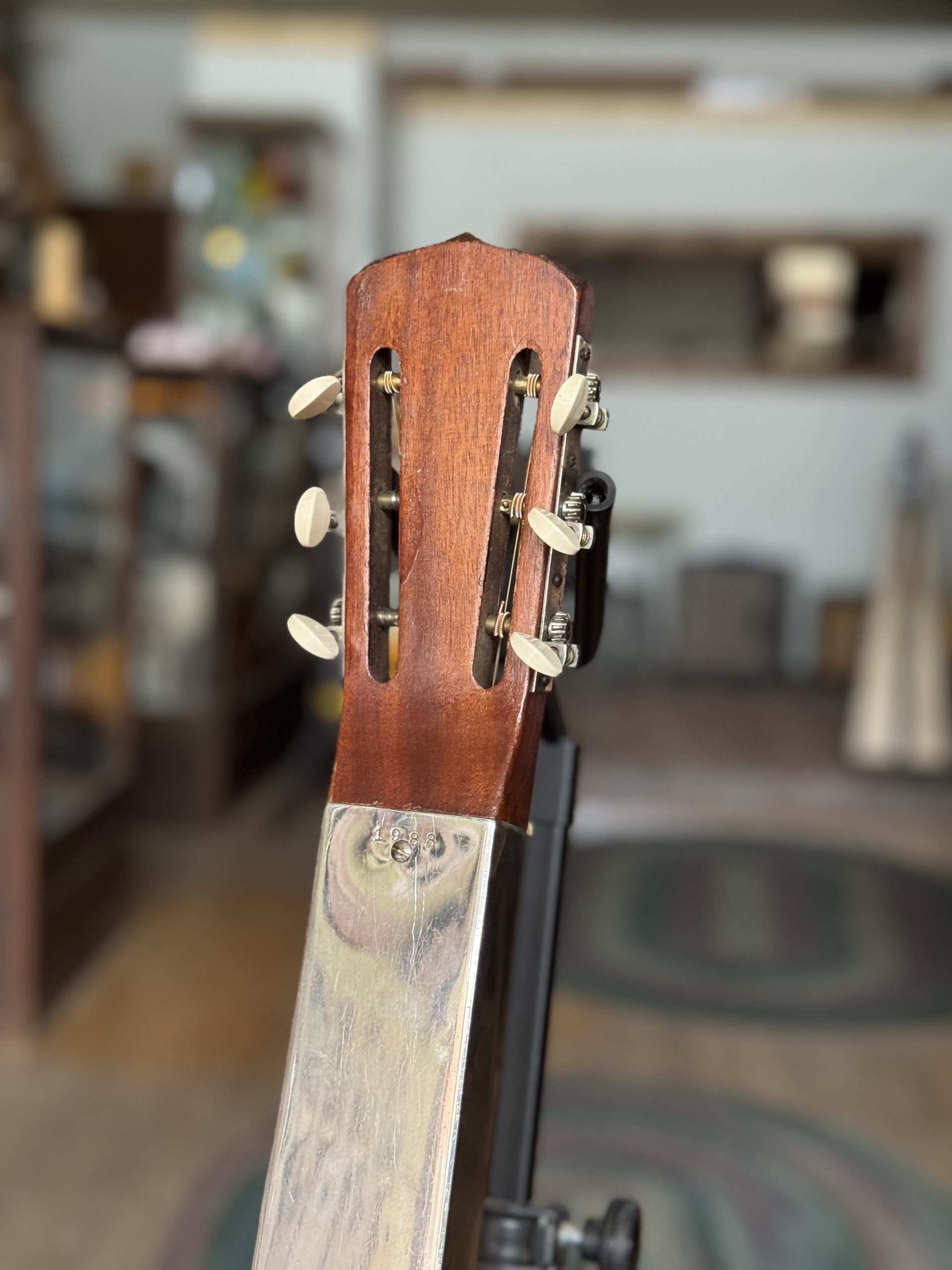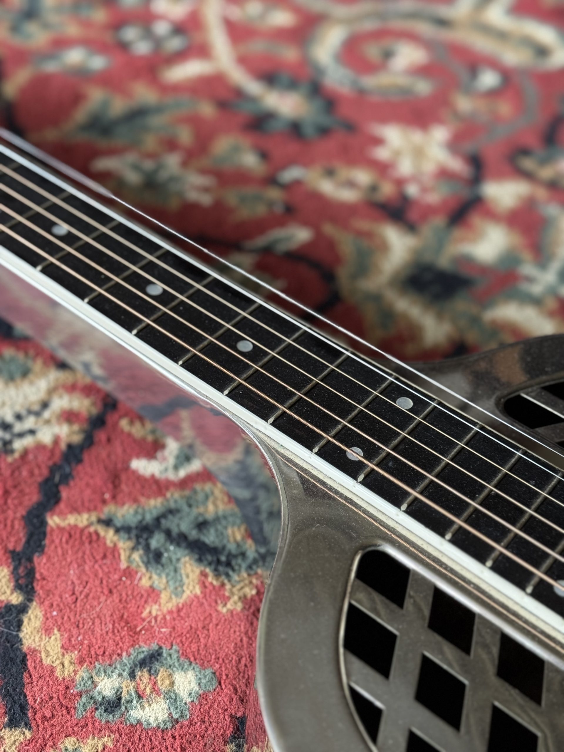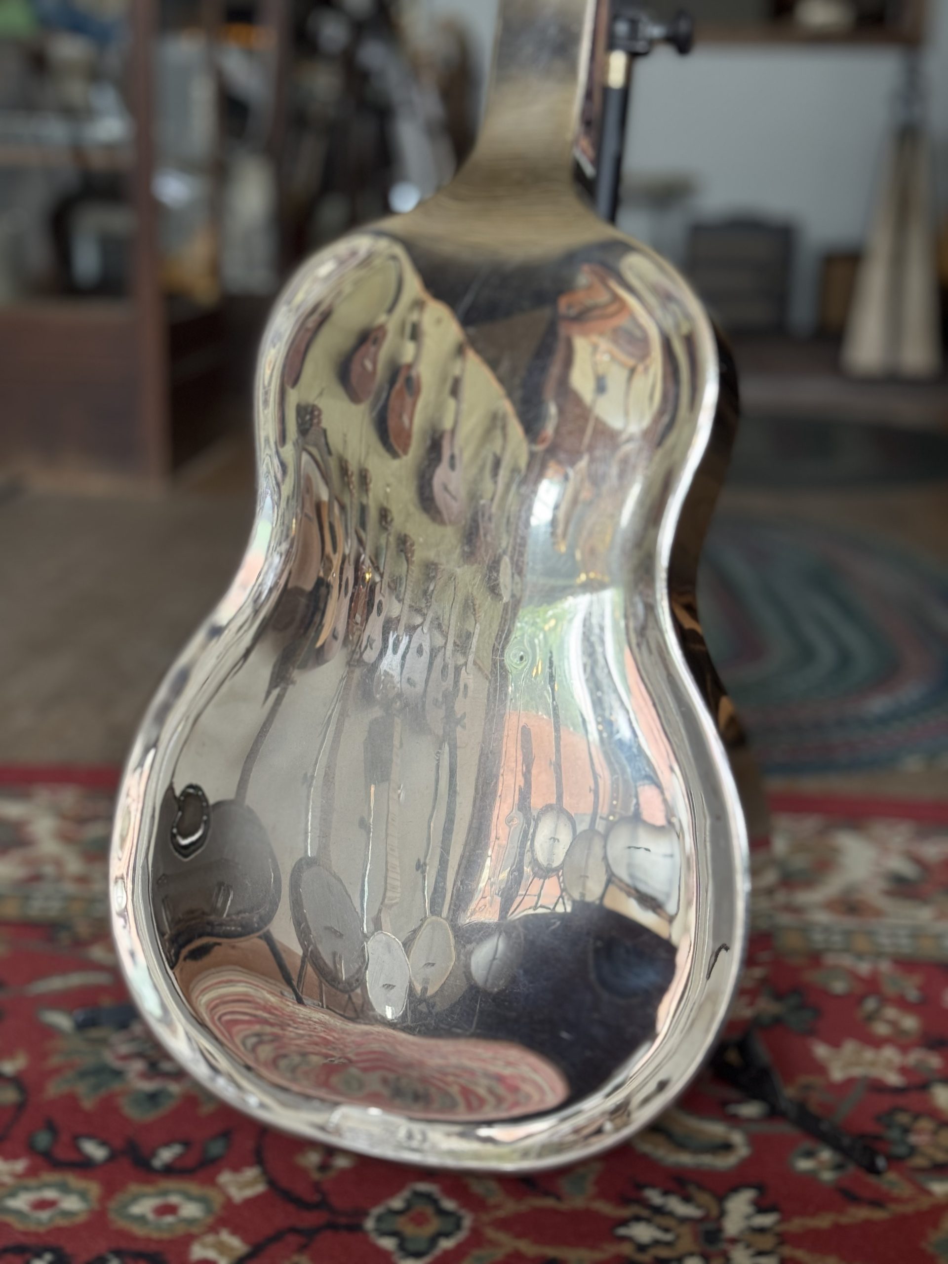 An advertisement of the era stated, “A Steel Guitar with twice the volume and three times the carrying power of the best wood guitar ever made… Records better, broadcasts better, sounds better and looks better than any guitar ever made. This new invention takes the guitar out of the parlor instrument class and makes a concert instrument of it suitable, for the largest theater or auditorium.” Strong words, but understandable considering the futuristic nature of such an instrument developed at the tail end of the Roaring Twenties and words that could be argued still hold up nearly a century later!